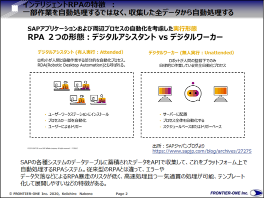 従来型RPAの処理が、1つ1つ行うオペレーショナルの自動処理(オペレーショナルRPAと仮称)であるのに対して、必要となるデータをプラットフォームに読み込んで一気通貫で自動処理するデータ駆動型の情報解析処理(インテリジェント)RPA(インテリジェントRPAと仮称)とイメージすることが出来ます。インテリジェントRPAの強みは、APIを介してデータを収集しているため野良RPAのようなシステムの暴走が生じにくいことと、収集蓄積したデータを一気に処理するのでオペレーショナルRPAのように1つ1つのオペレーション処理時間は必要なくより高速な処理が可能であること(設定を変更した再計算も簡単に可能)、業務ごとにチャットボットなどテンプレート化が簡単で展開しやすくROIが高いと思われます。また、ERPシステムの中で蓄積され、あまり活用されていなかったデータを有効活用する良いツールだと思います。実は、これに似た機能が国産クラウド会計システムのfreeeやマネーフォワードクラウドでAI機能として提供されています。今回紹介した製品に共通しているのは、クラウドのプラットフォーム上にデータを読み込んで自動処理しているところです。今後は、クラウドERPの普及が進むほど同様に国産クラウドERPでもこうしたインテリジェントRPAと連携する事例が増えていくことが予想されます。ERPとRPAは、担当者の作業時間短縮や効率化に貢献することから、連携するメリットや効果が今後さらに高くなると予想されます。