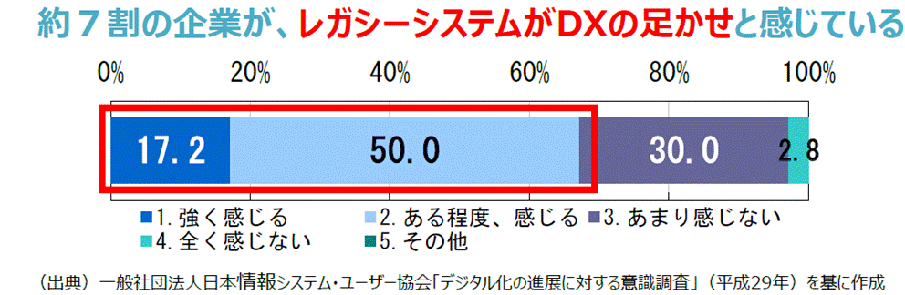 上記の資料によると約7割の企業がレガシーシステムはDX推進の足かせになっていると回答をされています。これは説明するまでもなく、DX化に合わせて修正することも難しくて、運用コストもかかっており、しかも多くは機関システムだったりするので、DX推進のシステム面での障壁になりますよね。そして、経済産業省の指標では2025年からこの件がトリガーになり毎年12兆円の経済損失が出るといわれています。
