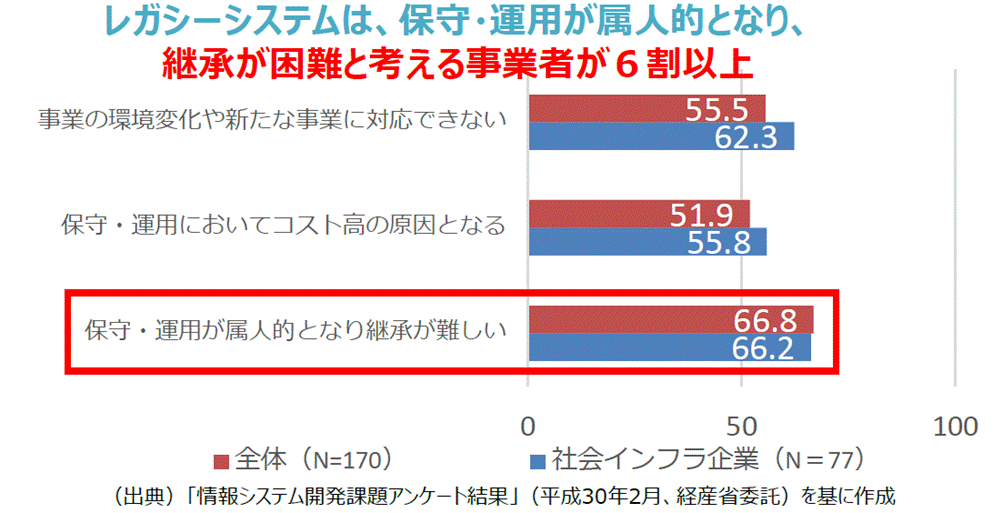 このデータで述べられているのは、レガシーシステムの保守が属人的になっていて、その継続が難しいという会社が6割強存在しているということです。