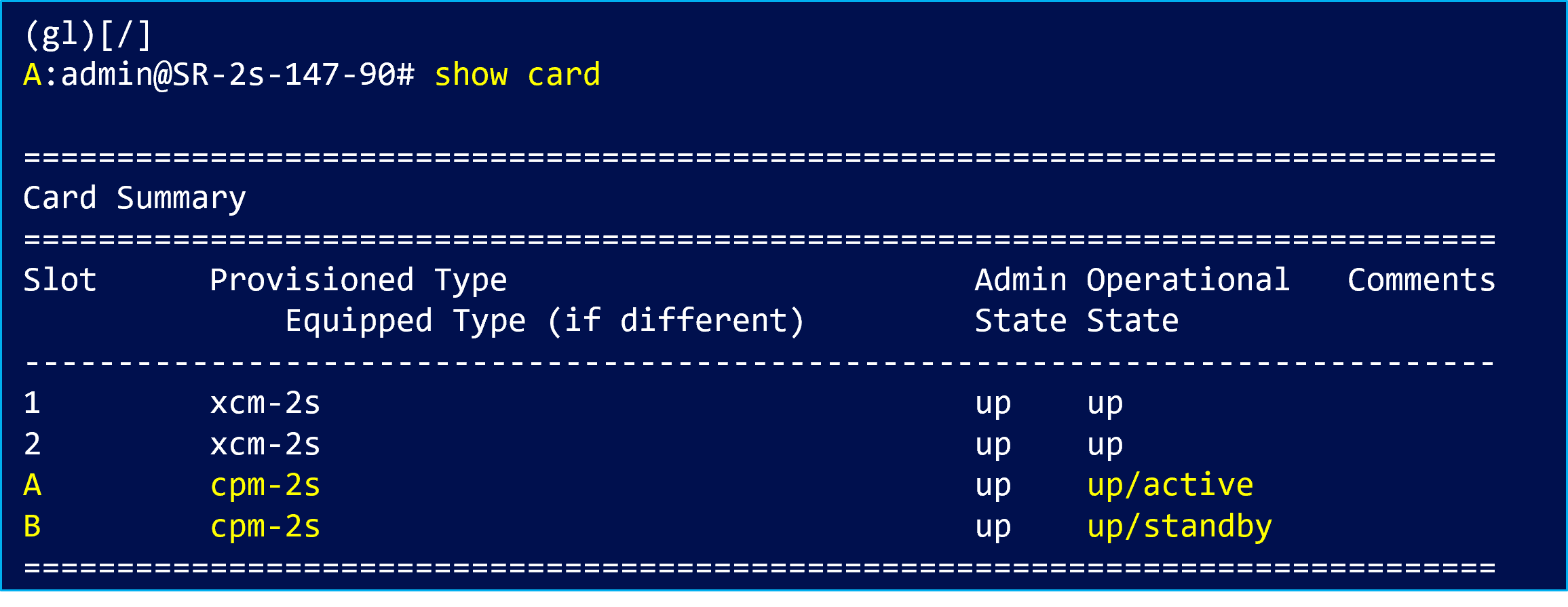 "show card"コマンドで CPM の状態を確認できます。Slot AがActive CPM、Slot BがStandby CPMとなっています。