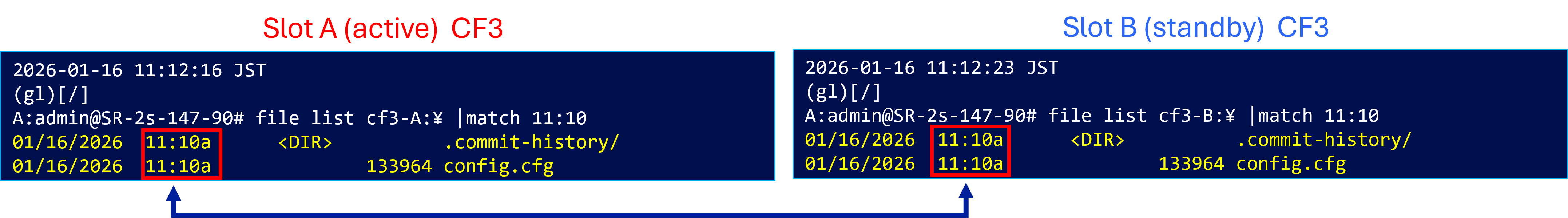 commitした時刻に、Standby CPMへconfig.cfgが同期されていることが確認できます。