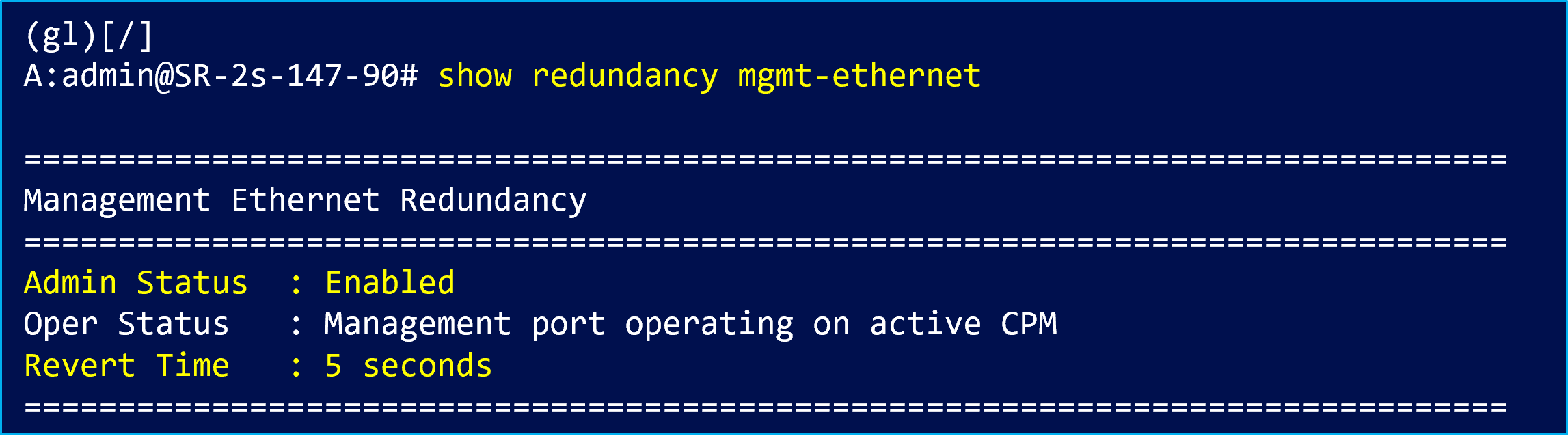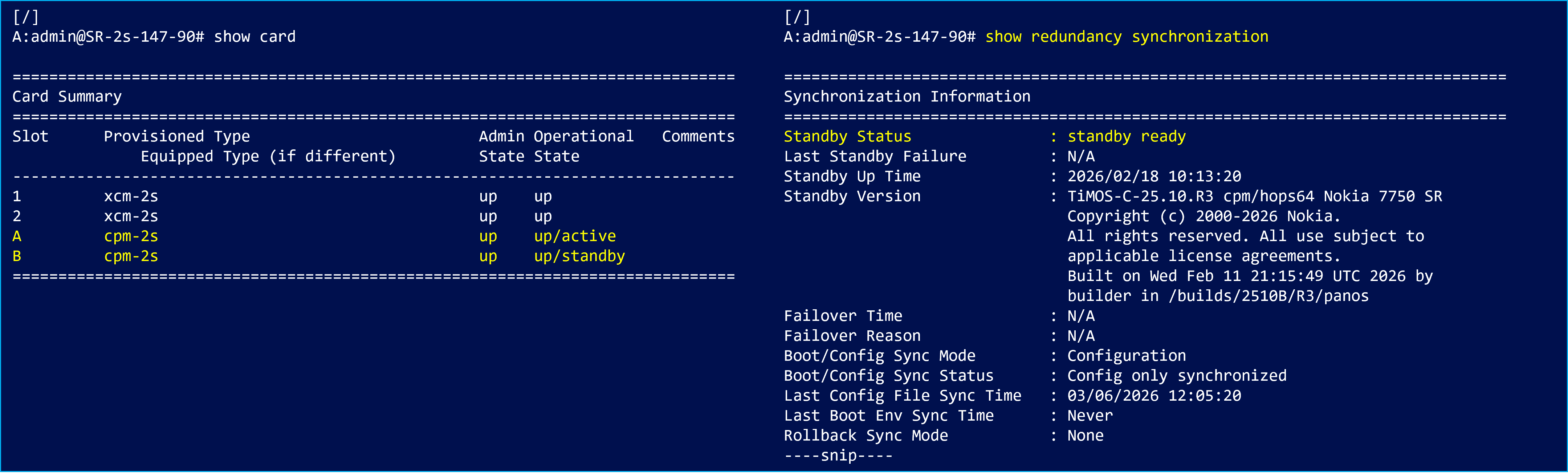 "show redundancy synchronization"コマンドでStandby CPM側のステータスを確認できます。ステータスが“standby ready” となっており、Standby CPM が Active CPM のスイッチオーバーに備え、システム制御を引き継げる状態で待機していることが確認できます。