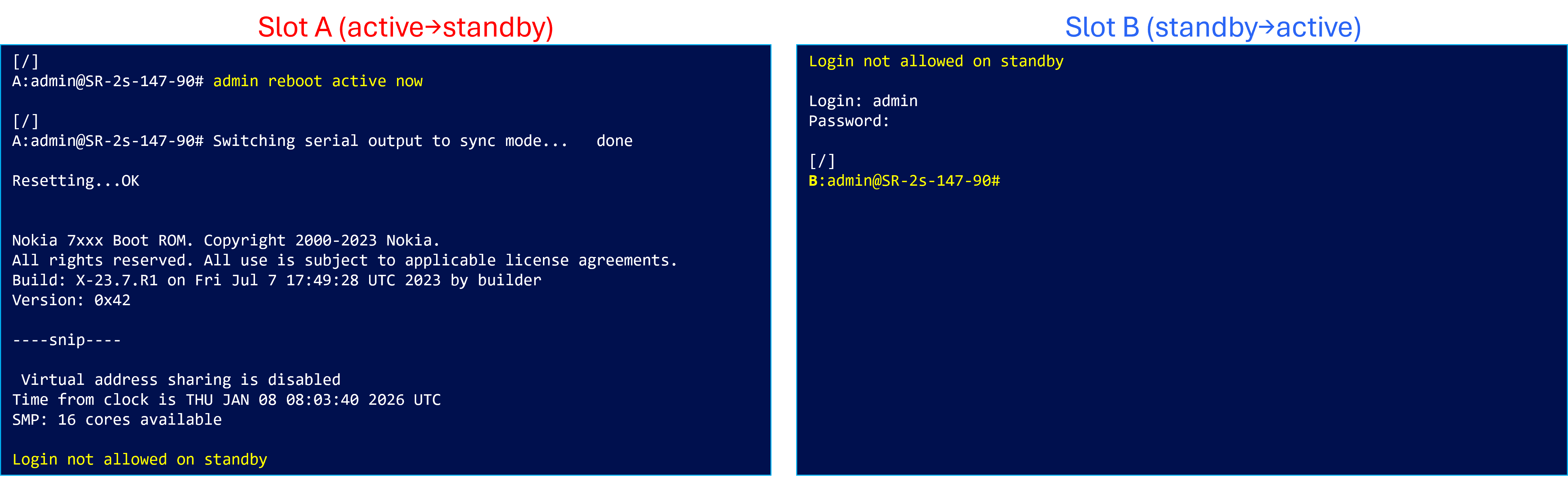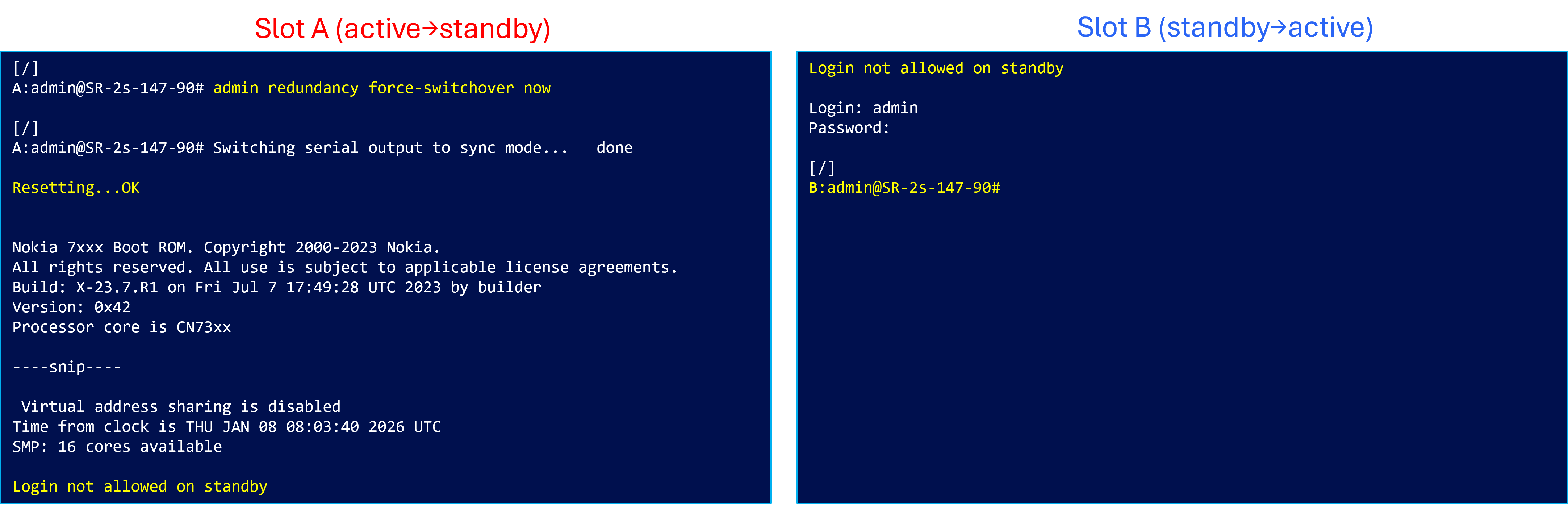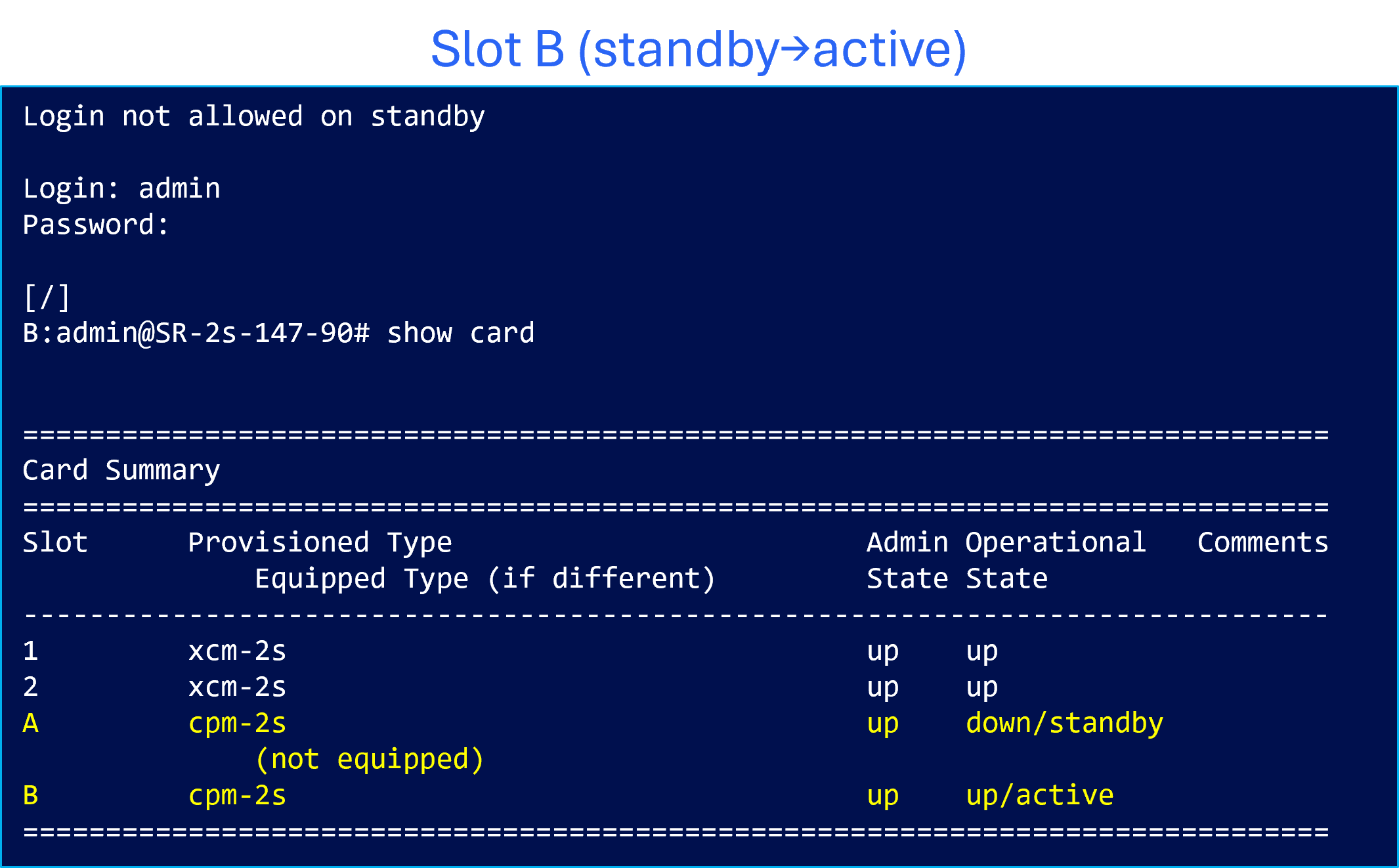Standby CPMだったSlot BがActive CPMに昇格しログイン可能となりました。旧Active CPMのリブートを契機にスイッチオーバーが行われたことが確認できます。