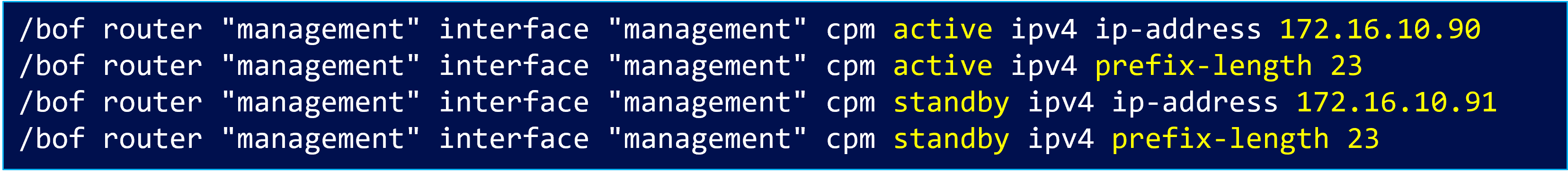 CPM 冗長構成を運用するうえで重要なのが、管理 IP アドレスの扱いです。SR OS では BOF(Boot Option File) と呼ばれる、CPM 起動時に読み込まれる基本設定ファイルに、Active 用と Standby 用、それぞれの管理 IP アドレスを定義します。