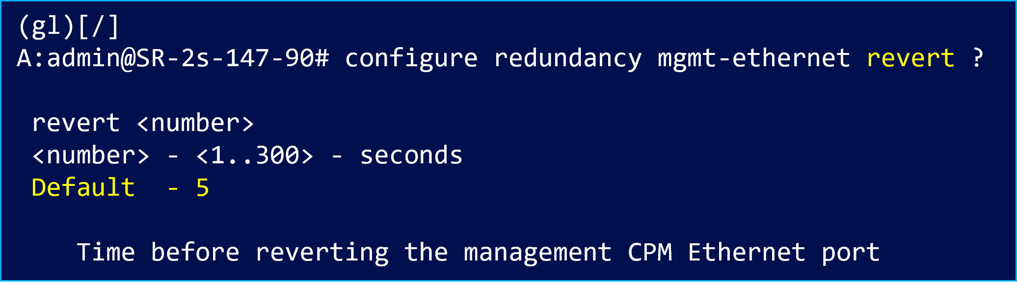 この設定は、プライマリ(Active)CPM のマネジメントポートが復旧した後、何秒待ってから元のポートに戻すかを指定するものです。
