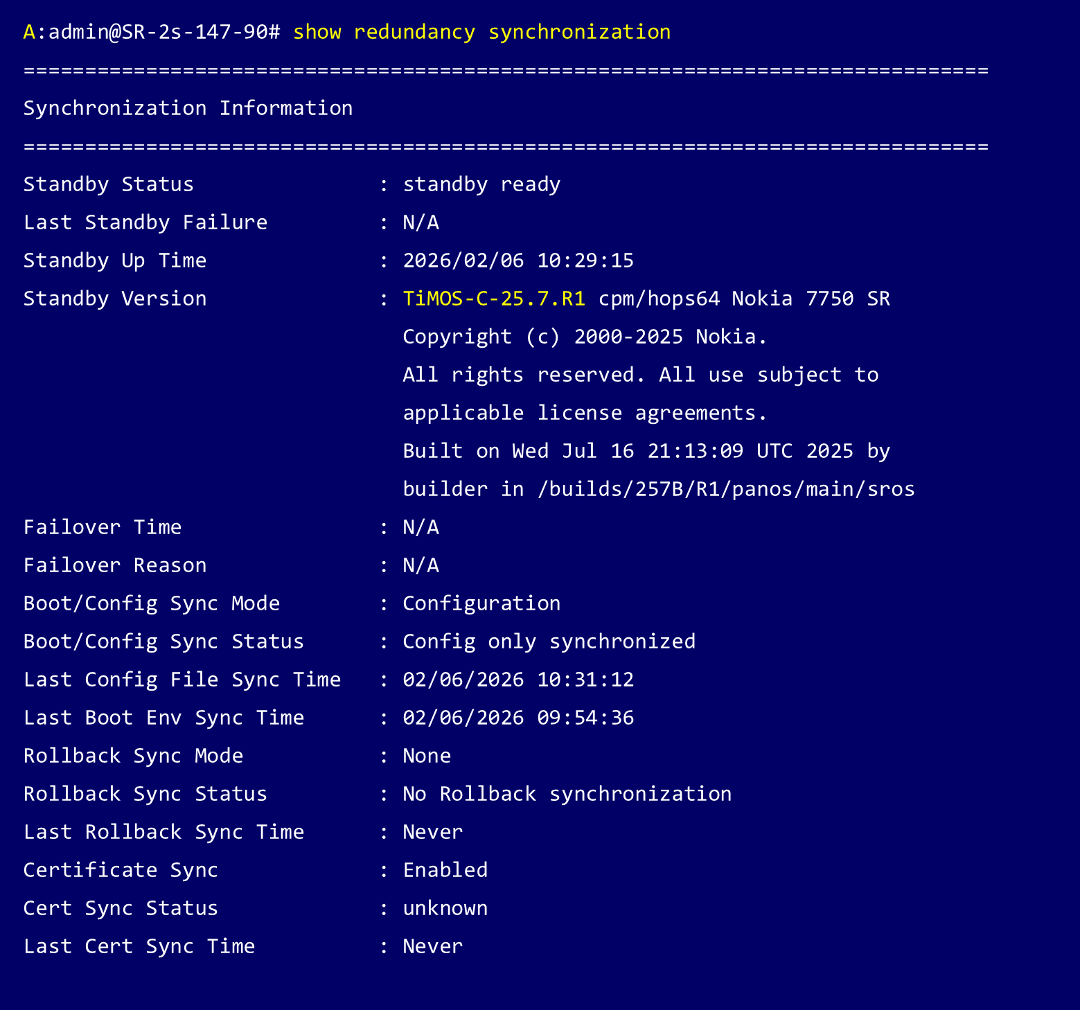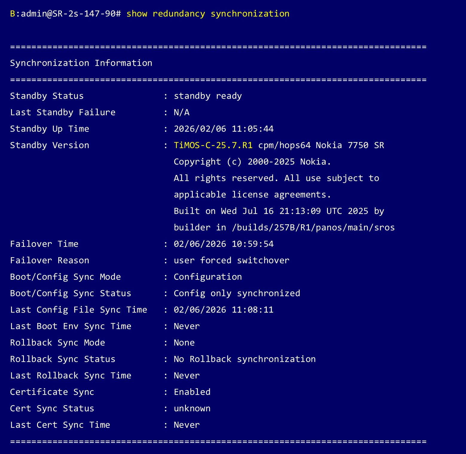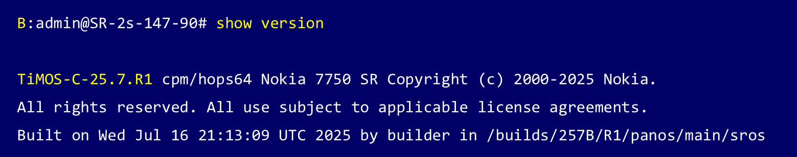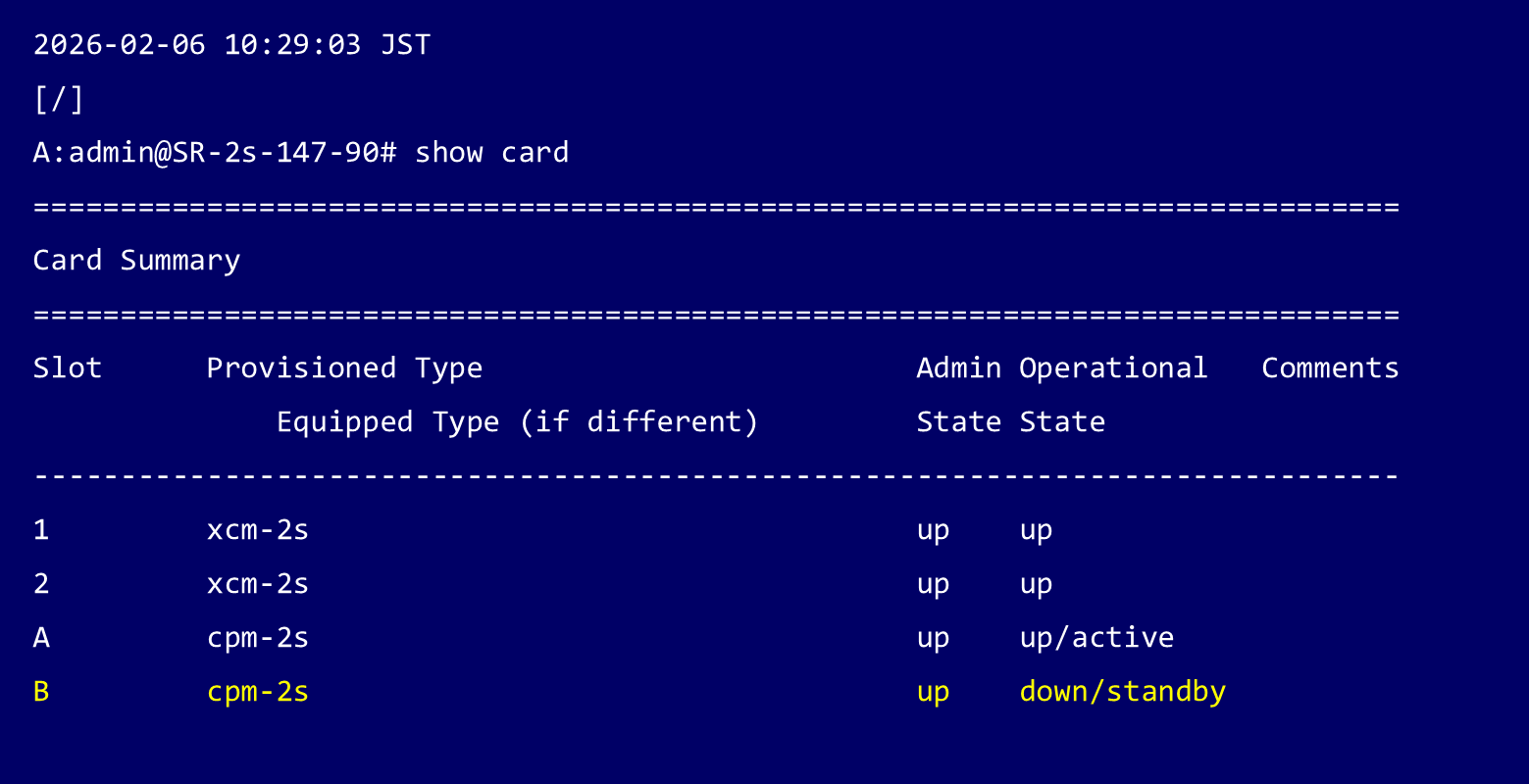 Nokia 7750 SR-2sでコントロールプレーン(CPM) を冗長構成(Active / Standby)で運用している場合、まず Standby CPM に新しいソフトウェアを適用・起動させ、その後 Active CPM を切り替えることで、サービスを継続したままアップグレードを完了できます。