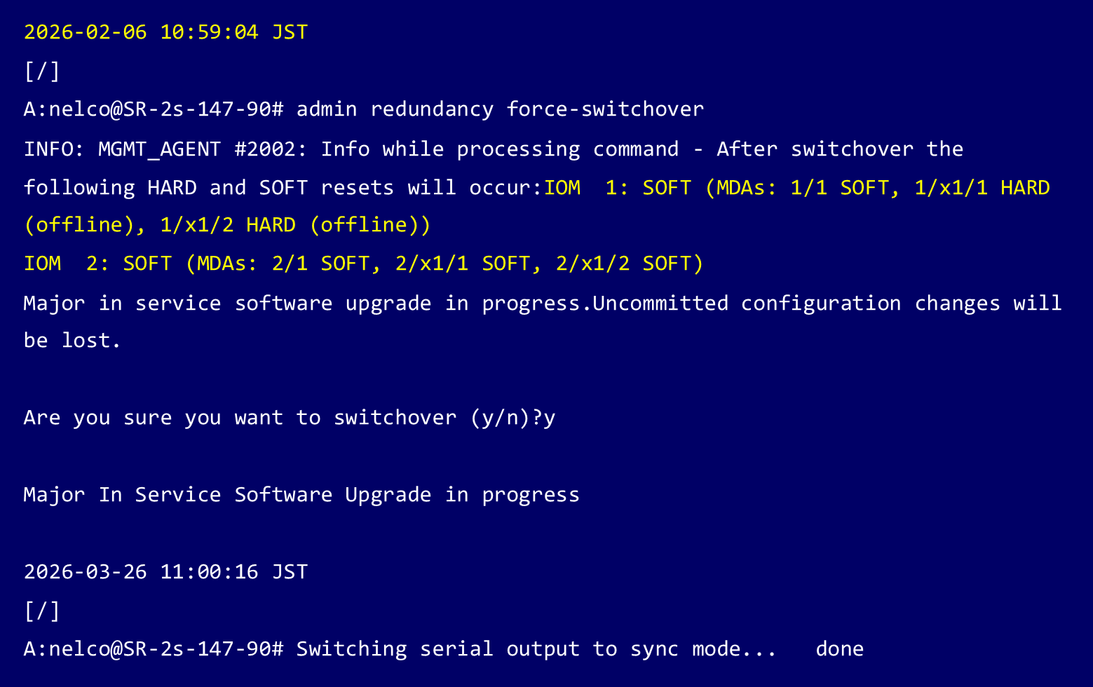 スイッチオーバーには”admin redundancy force-switchover”コマンドを実行します。ラインカードに対してSoft Reset 又はHard Resetを実行するかのメッセージが表示され、スイッチオーバーの実行の可否を選択します。
