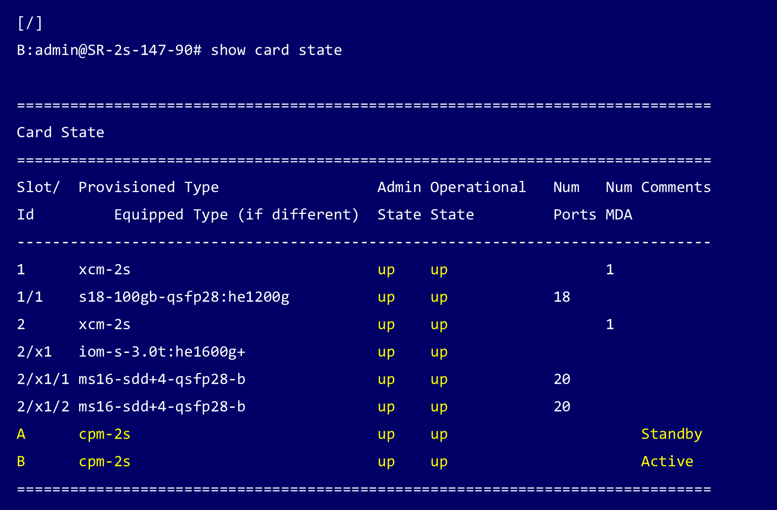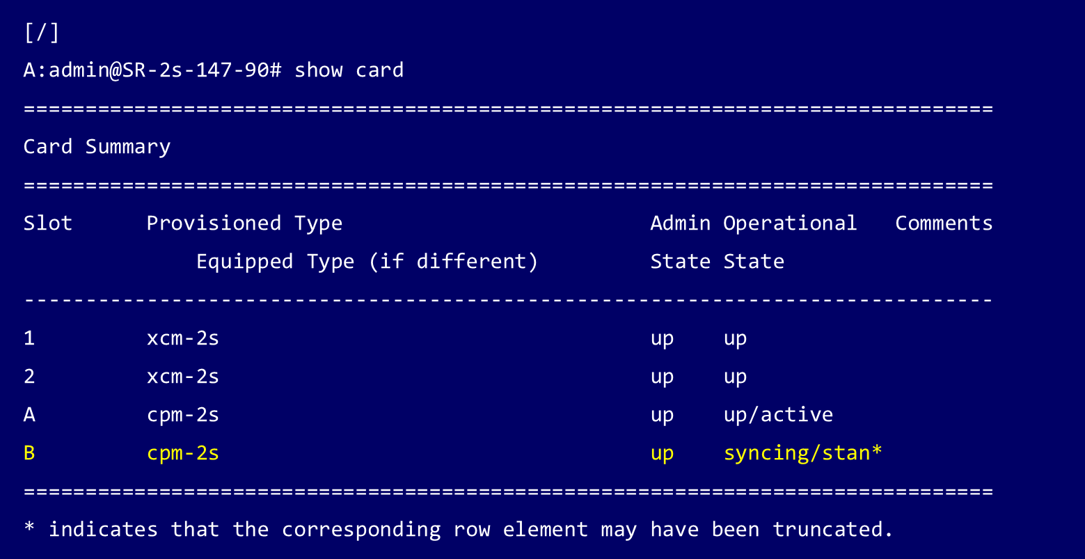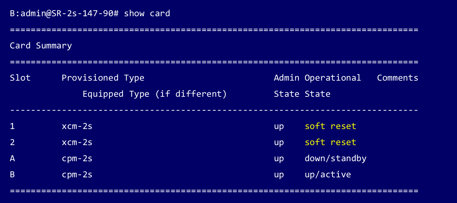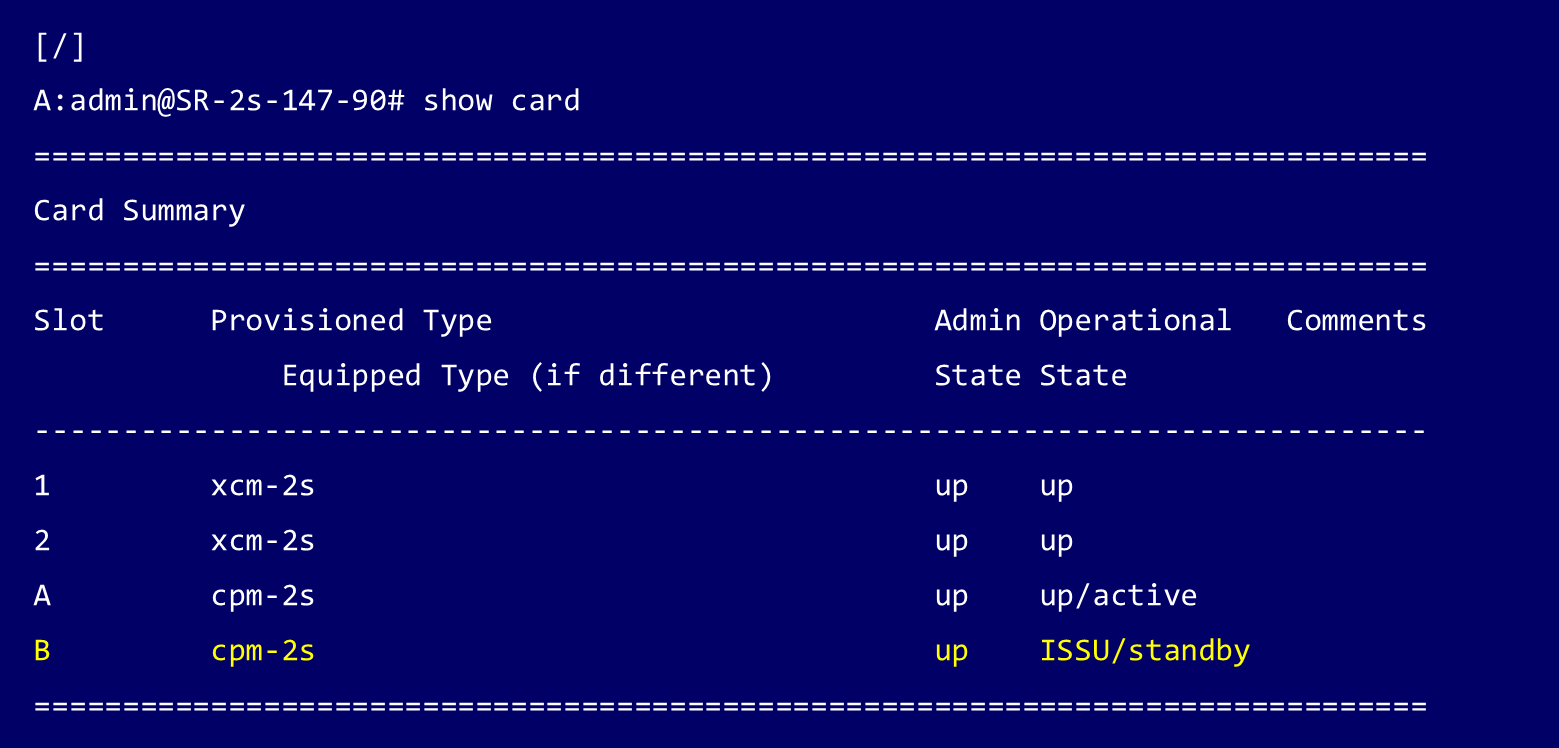 Standby CPM(この例ではSlot B)が起動するとステータスはsynching(同期中)と表示されます。Standby CPM の同期が完全に完了すると、Standby CPM のステータスは ISSU と表示されます。