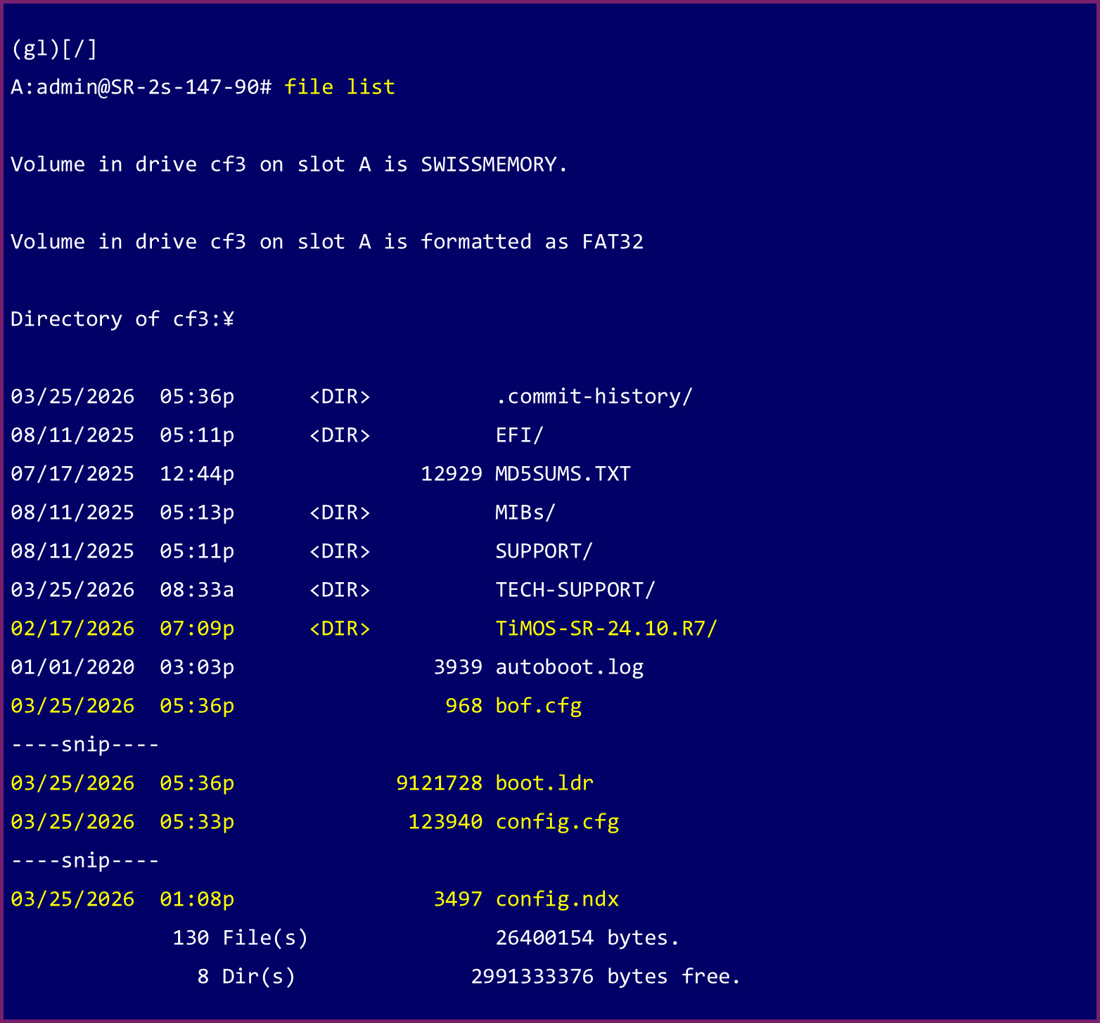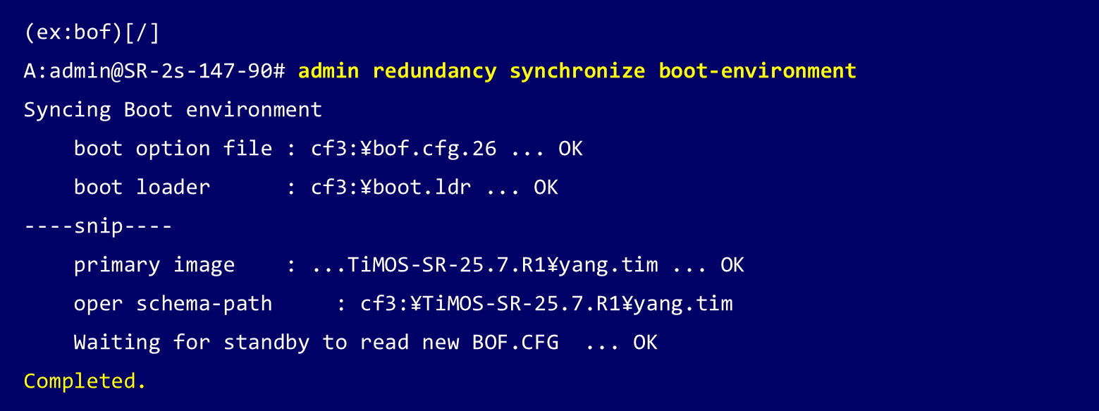ISSU を利用するためには、OS イメージや BOF(Boot Option File)といった 起動に必要なファイルが正しく準備され、両 CPM で同期されていることが前提条件となります。