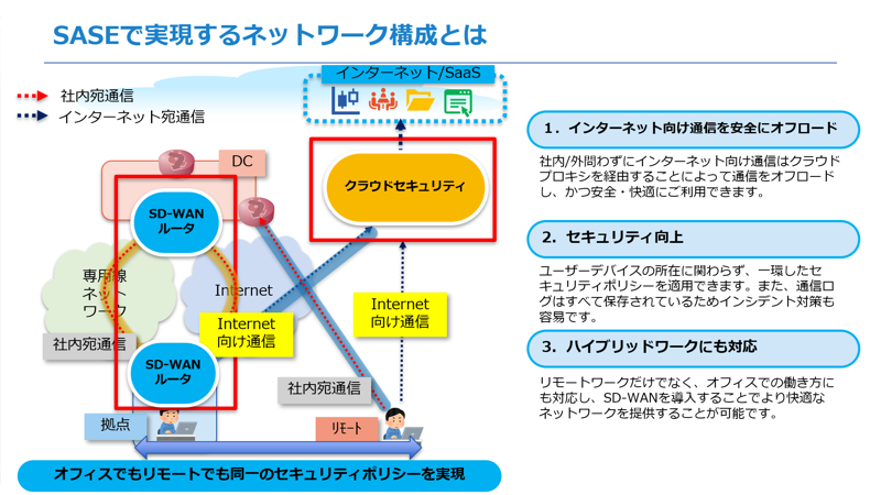 まず、拠点間のネットワークについてはSD-WANを導入することで、インターネット向け通信はデータセンターを介さずに直接インターネットに向けてオフロードさせます。