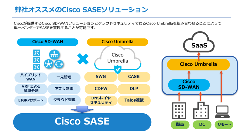 Cisco SASEソリューションは、「Cisco SD-WAN」とクラウドセキュリティである「Cisco Umbrella」によって構成されています。これら2つを組み合わせることによって、どこからでも安全にアクセスできるネットワークとセキュリティを単一のベンダー、プラットフォームで提供することが可能になります。
