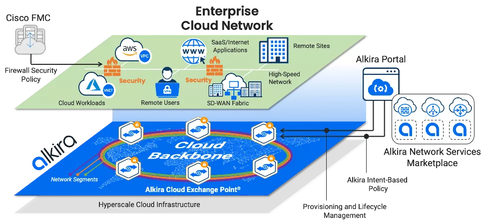 シスコのファイアウォールは、Alkiraプラットフォームに接続された企業のオンプレミスサイト間の通信を保護します。この東西通信はAlkira Cloud Exchange Pointsを通過しますが、パブリッククラウド環境向けではありません。
