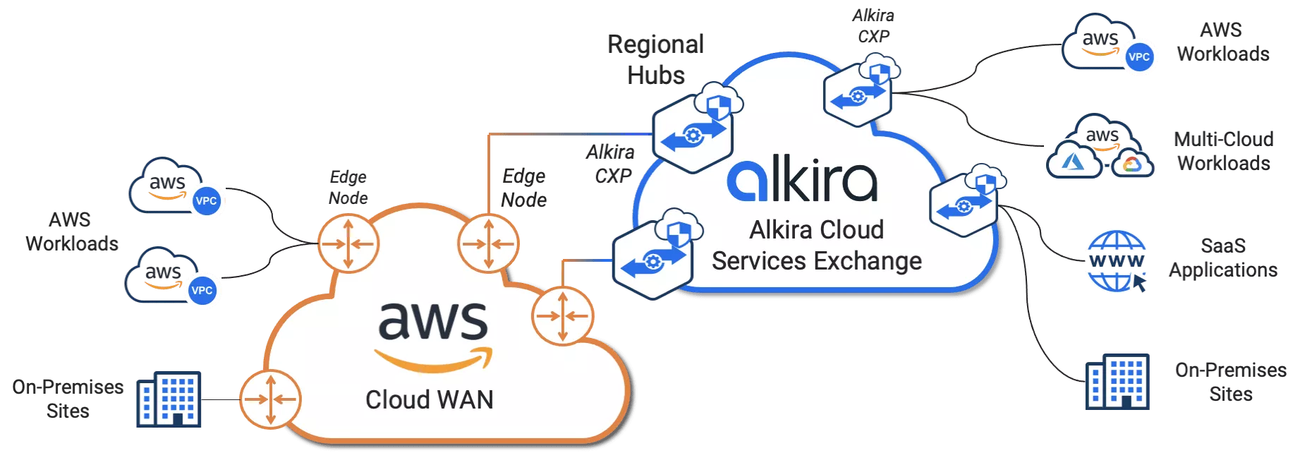 共同ソリューションは、AWSクラウドWANエッジロケーションと世界中のAlkiraクラウドエクスチェンジポイント(Alkira CXP)間のコントロールプレーンとデータプレーンの統合を提供します。 Alkiraクラウドエクスチェンジポイントは、柔軟性のあるスケール、高度なネットワーク制御、および対称的なサービス挿入機能を備えた、グローバルに分散された仮想ポイントオブプレゼンスです。 AWS Cloud WANエッジロケーションとAlkira CXP間のクラウドネイティブ仮想クロスコネクトは、2つの環境間で非常に高いスループット、最小のレイテンシー、および高い復元力を実現するために最適にプロビジョニングされます。どちらの環境も、BGP動的ルーティングプロトコルを利用して到達可能性情報を双方向に交換し、いずれかの環境に接続されているクラウドとオンプレミスのリソースが相互に通信できるようにします。