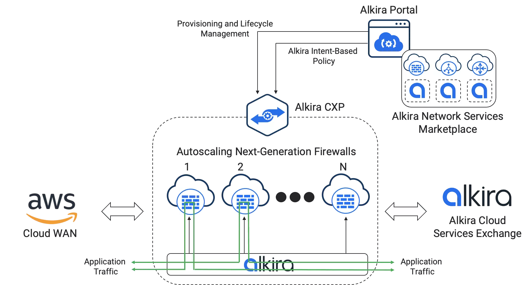 Alkiraのインテントベースのポリシーにより、管理者は、次世代ファイアウォールに向けて対称的に誘導されるアプリケーショントラフィックを柔軟に選択できます。 2つの環境間のアプリケーショントラフィックの必要性は時間とともに変化するため、Alkiraのソリューションは、リアルタイムの需要に基づいてファイアウォール容量を自動スケールアップおよびスケールダウンします。
