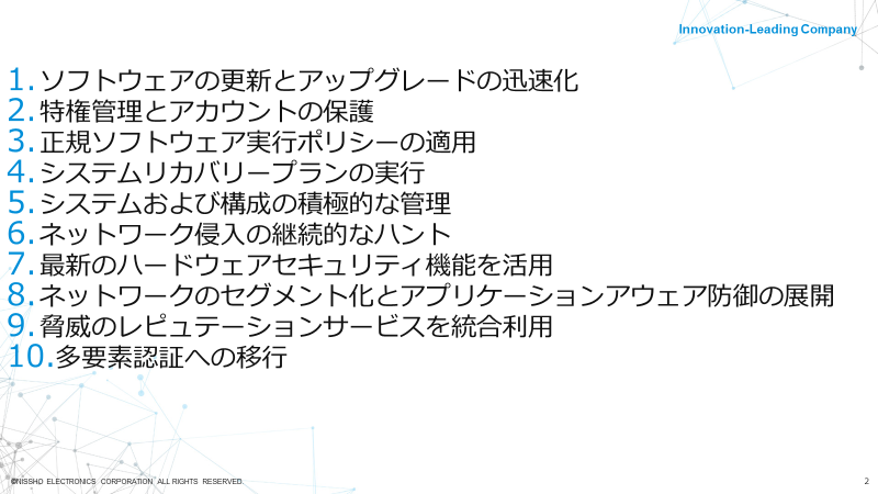 サイバー攻撃を成功させないための有効策として以下が挙げられます。