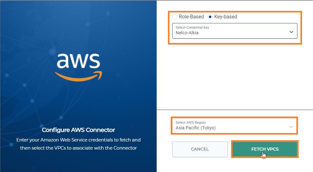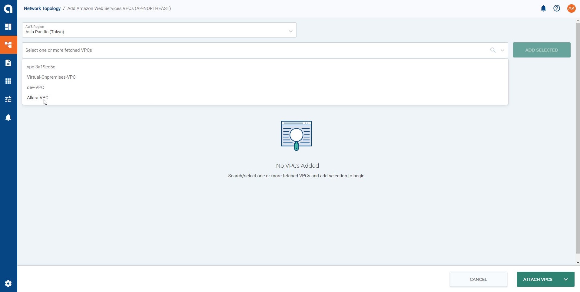 今回はAWSに接続したいので「add AWS Connector」を選択し、Alkiraがリソースを作成するためのIAM情報を選択します。 こちらを選択することで指定した仮想ネットワーク上に必要なリソースを自動デプロイできるようになります。