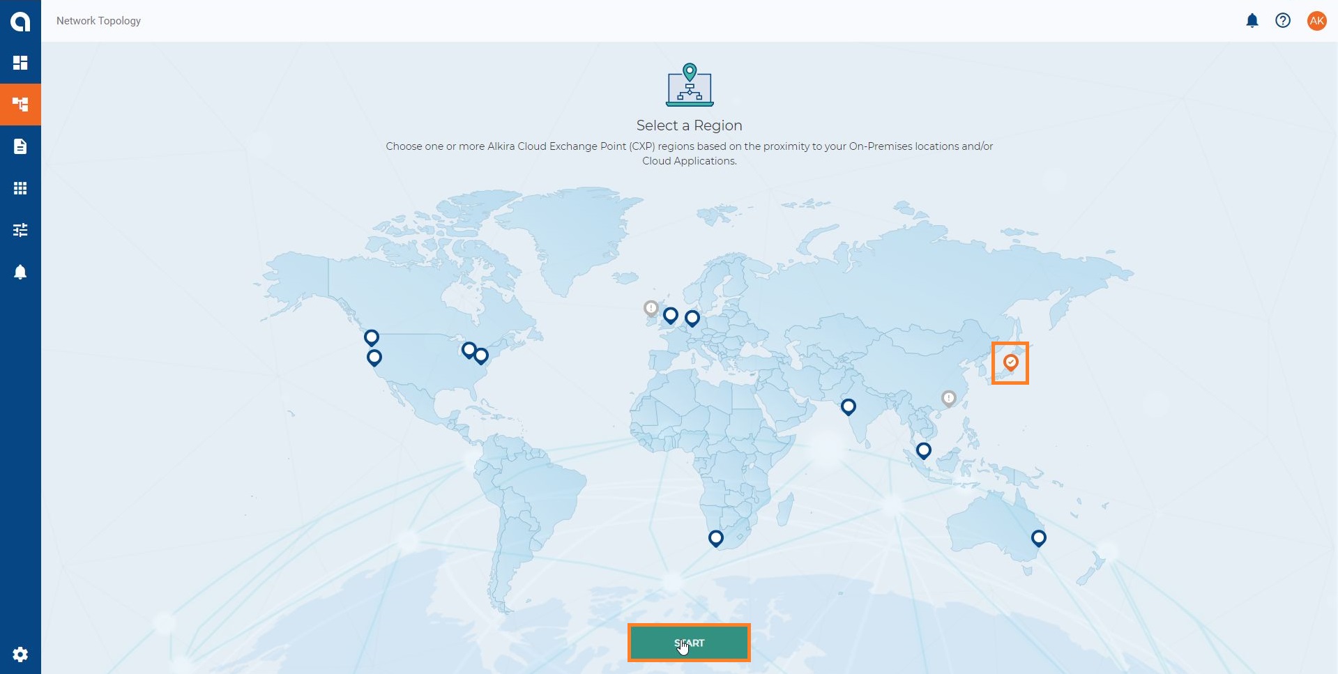 Alkiraポータルにアクセスし、画面の世界地図からCXPを置きたいリージョンを選択し「START」をクリックします。