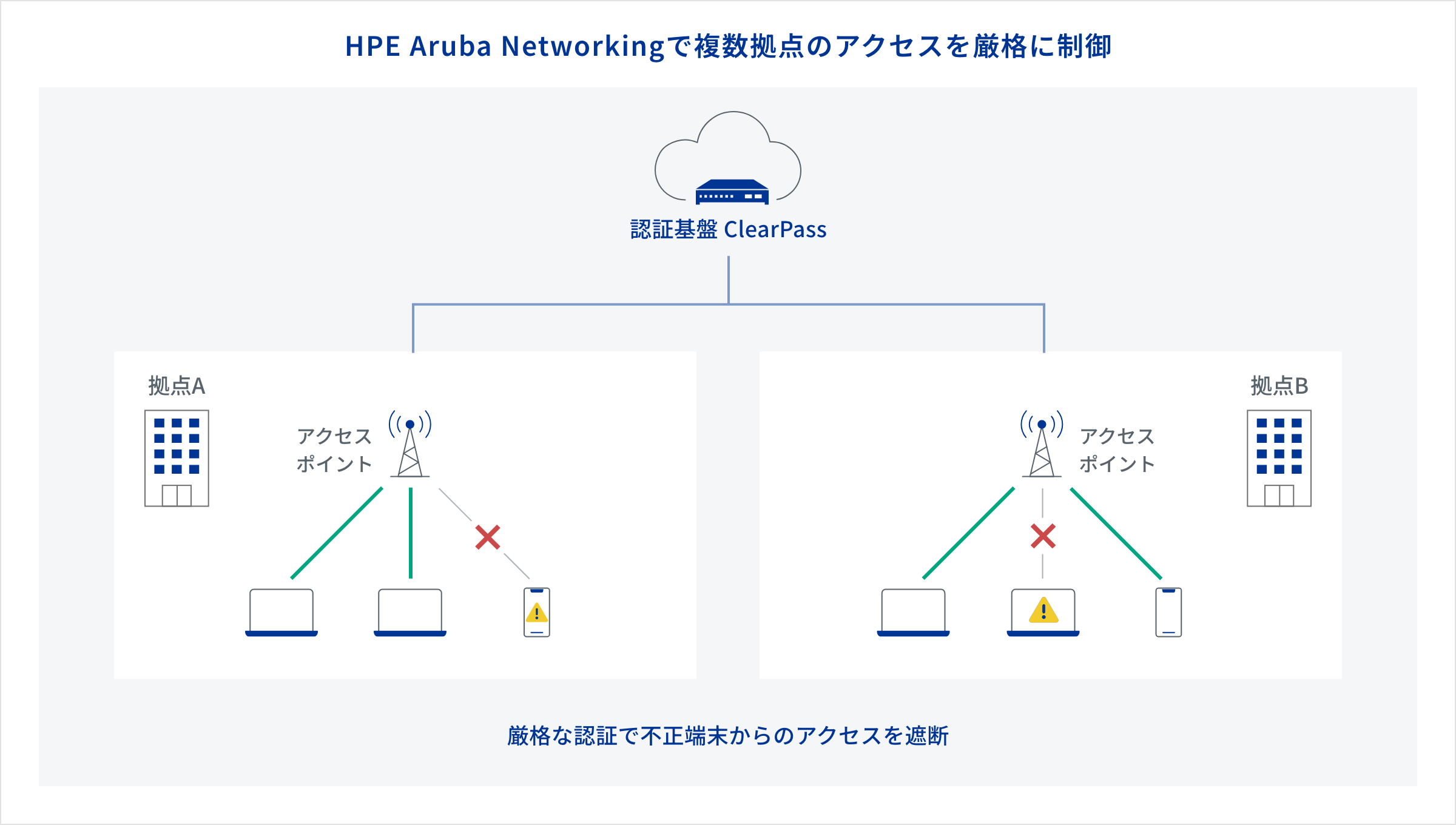 認証基盤「ClearPass」が、接続する全デバイスを厳格に認証・プロファイリング。接続後も動的なアクセス制御を継続し、不正な侵入を未然に防ぎます。