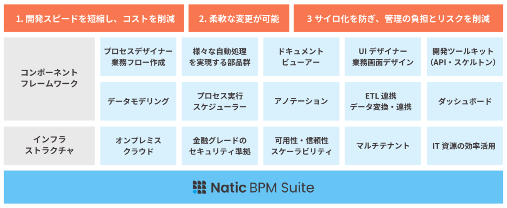 業務プロセスデザイン、実行、モニタリング、分析、コンテンツ管理の機能を網羅