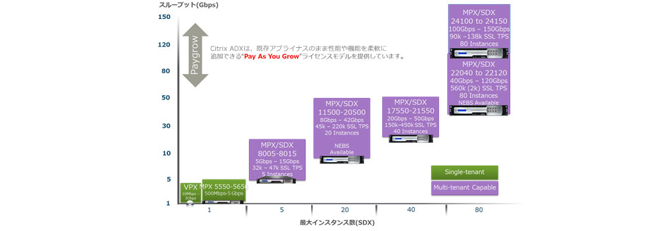 Citrix ADCファミリーではアプライアンスを追加購入せずにアップグレードライセンスを購入するだけでアプライアンスのもつ最大の性能まで拡張できるため、初期投資を抑えつつ高いコストパフォーマンスを実現します。