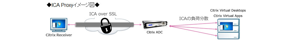 お客様が仮想デスクトップや仮想アプリケーションを導入する目的に"いつでも どこからでも仕事ができる環境を整備するという目的があります。その目的を達するためには社外から安全に接続ができる基盤が必要となります。Citrix ADCファミリーはCitrix Virtual Desktops / Citrix Virtual Appsで利用されるICA通信をSSLで暗号化してセキュアに接続を確立するICA Proxy機能を備えております。このICA Proxy機能は他のSSL VPN装置の製品に比べて以下の優位性があり、お客様のTCO削減に寄与します。