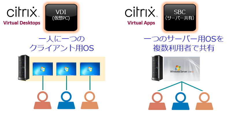 Citrixでは、アプリケーションやサーバーデスクトップを配信するSBC方式をCitrix Virtual Appsで、フルデスクトップを配信するVDI方式をCitrix Virtual Desktopsで提供します。
