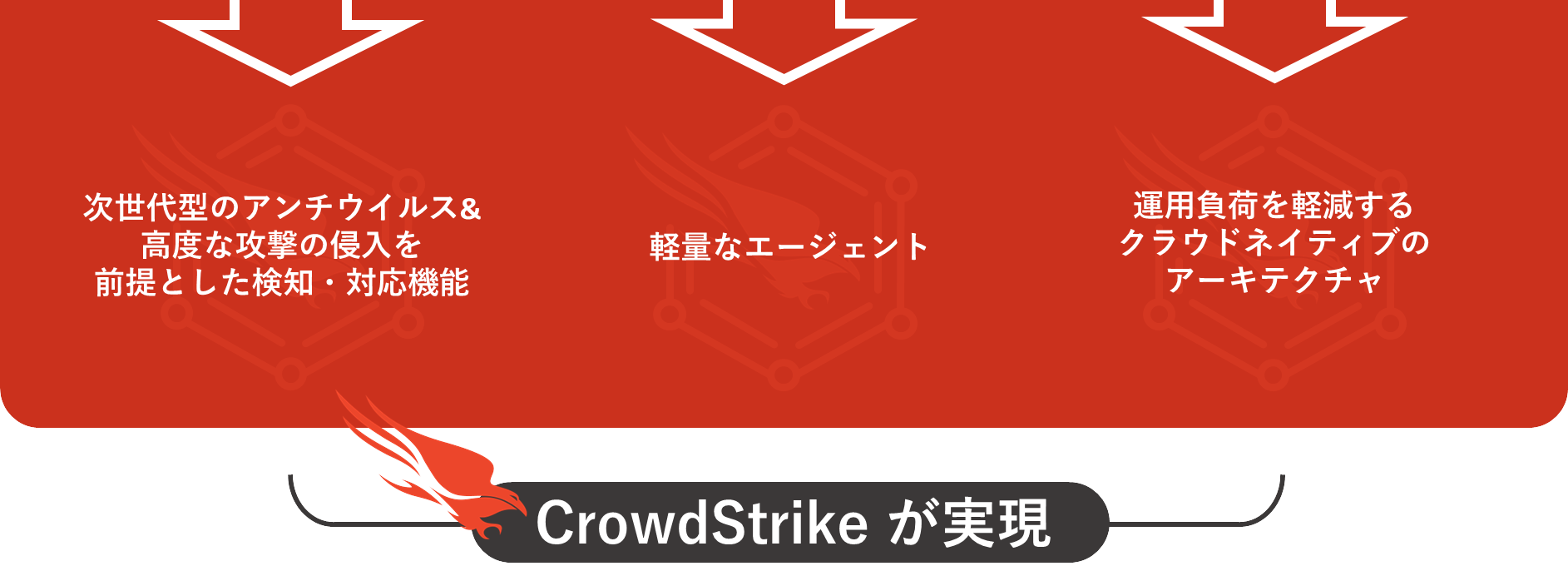 NGAV/EDRやその他のさまざまなモジュールが、軽量なシングルエージェントで動作しているため、運用や管理は非常に簡単です。 機能拡張もシングルプラットフォームで容易に行えます。CrowdStrikeは機械学習や人工知能、振る舞い分析、 プロアクティブな脅威ハンティングを1つのソリューションに統合し、脅威のライフサイクル全体を通じて保護します。