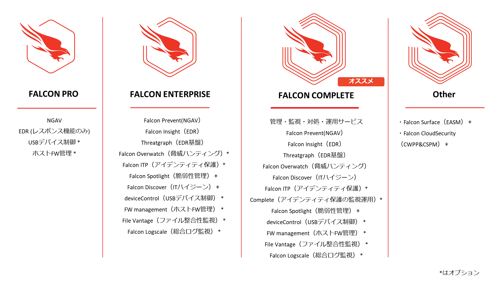 CrowdStrikeのライセンスプランは「Falcon Proプラン」、「Enterprise プラン」、「Complete プラン」、「その他」の4種類で構成されております。