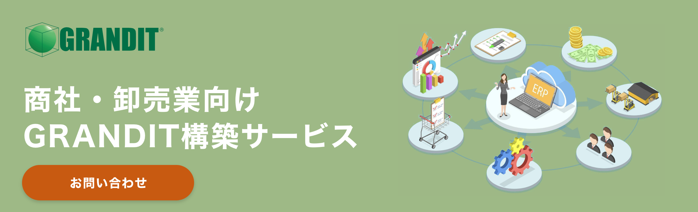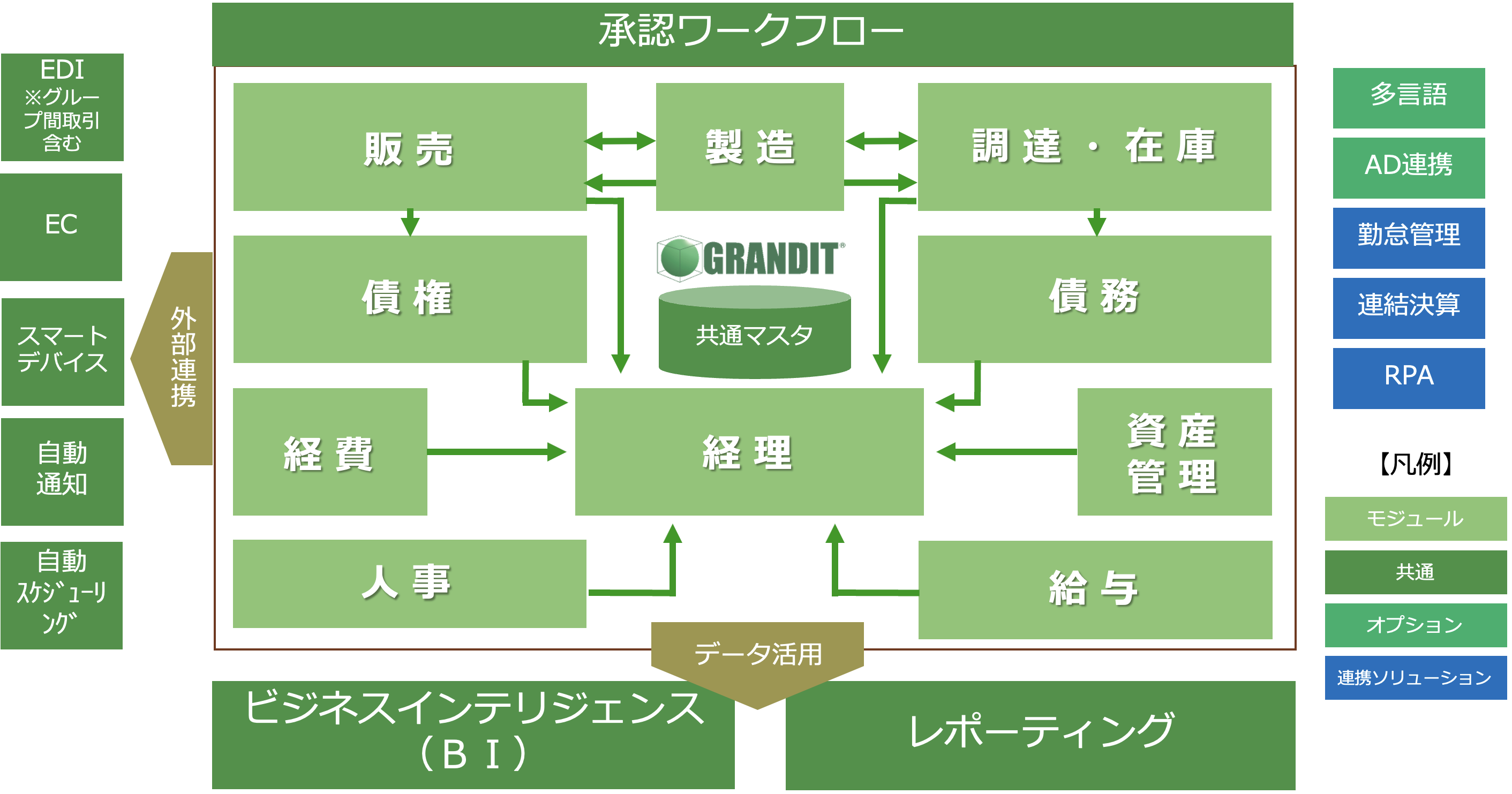 ワークフロー、EDI、EC、BI(ビジネスインテリジェンス)などの標準搭載はもちろん、企業グループや取引先までをシームレスに結ぶことで市場ニーズに応えた機能強化と、国際化、多様化の時代を迎えたオールインワンERPがGRANDITです。