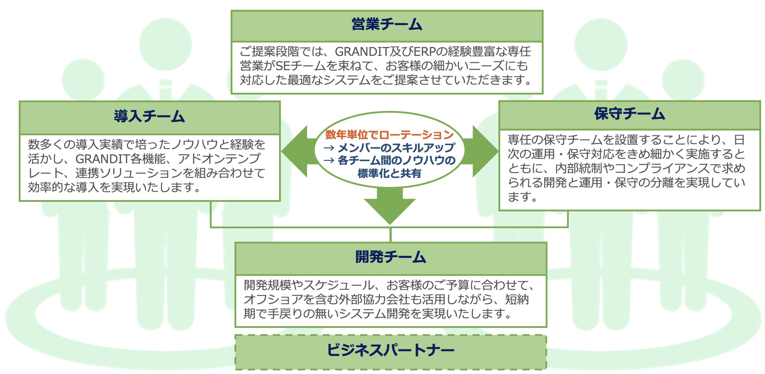 現在、GRANDIT保守対応企業は50社以上であり、多くのお客様の生の声と日々のご要望に真摯に対応することで、さまざまな環境や業種・業態の違いを吸収し、安定したシステム運用を実現しています。