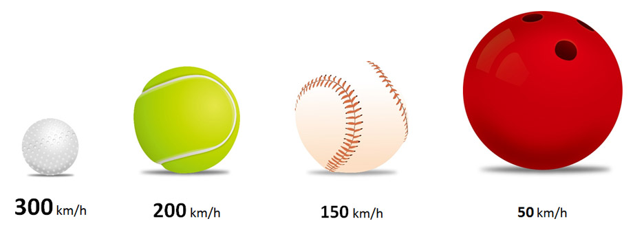おおよそ30~50km/hくらいだそうです。野球ボールは剛腕で150km/h。テニスボールは200km/h。ゴルフボールは300km/hらしいです。球が小さく・軽くなると速度が上がり、より速く届きます。