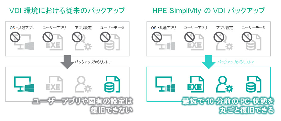 SimpliVityであれば、VDI環境のすべての仮想PCをOS丸ごとイメージバックアップできます。前述のとおり250,000個バックアップできますので、数千ユーザーの規模でも問題ありません。しかも、前述のとおり10分や30分単位でバックアップ可能。故障したの仮想PCを「ギリギリ直前」の状態へ"丸ごと""一瞬"で復旧することができるわけです。まさに元通り。