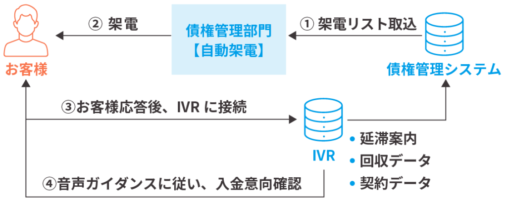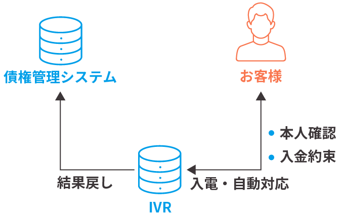 - 折り返し電話に対して、IVRでの対応を行い、入金約束の自動取得