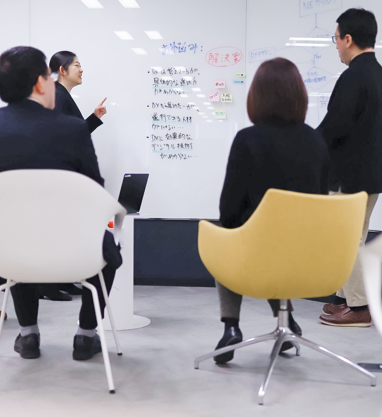 DX化に応える体験型ワークショップテクノロジ総合環境 DX化を具体的に理解いただくため、ディスカッションの上で体験いただき、 お客様の未来像を具体的にイメージいただけるサービスとして、 「NELX」をご活用ください!