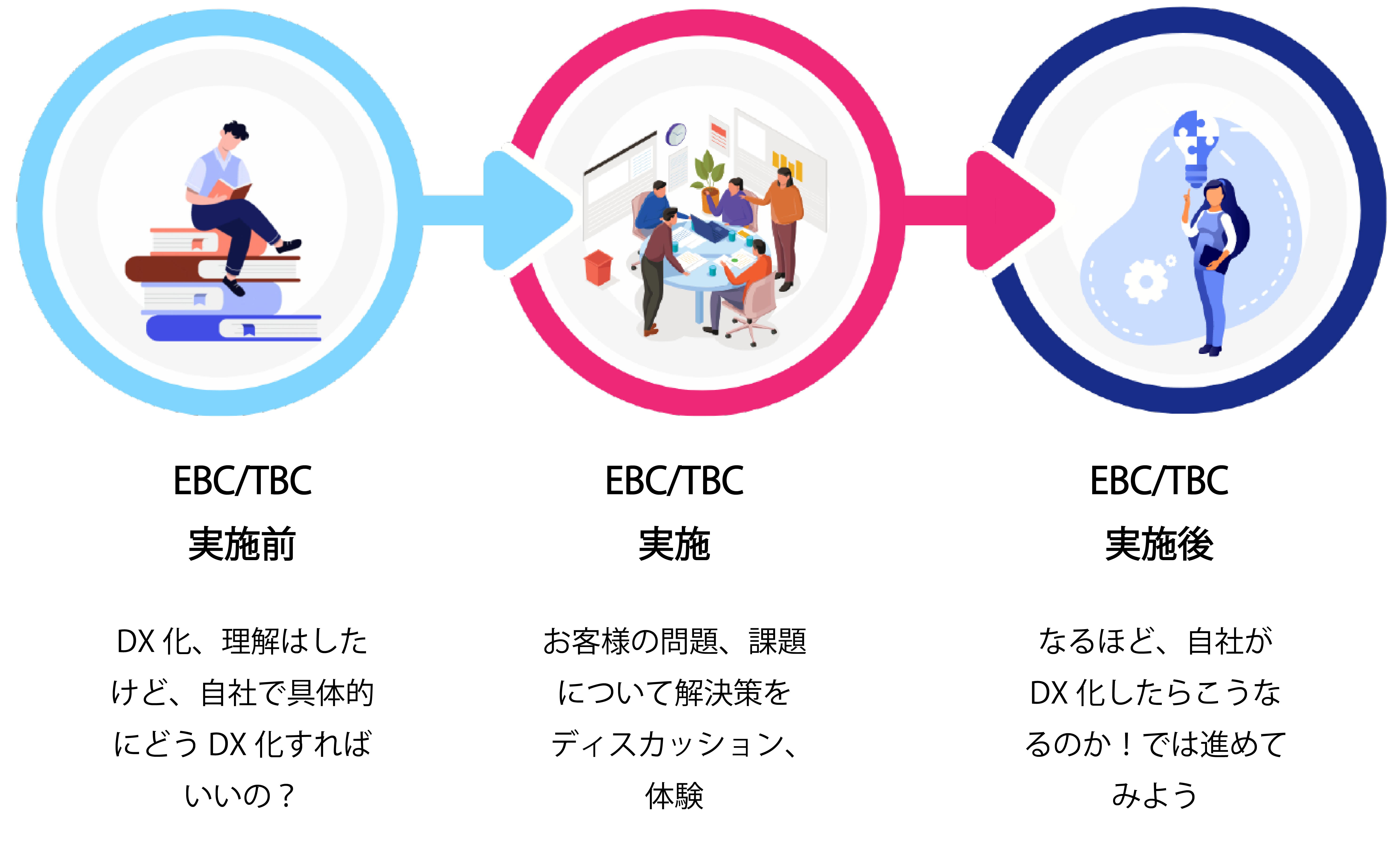 EBCでは、DXを実現するためのディスカッションを行っていただけます。最新のデジタル技術を紹介差し上げながら、お客様の未来像に向かってディスカッションを行います。お話には、お客様の課題に応じた専門知識を持つスペシャリストが、経験をもとに対応致します。
