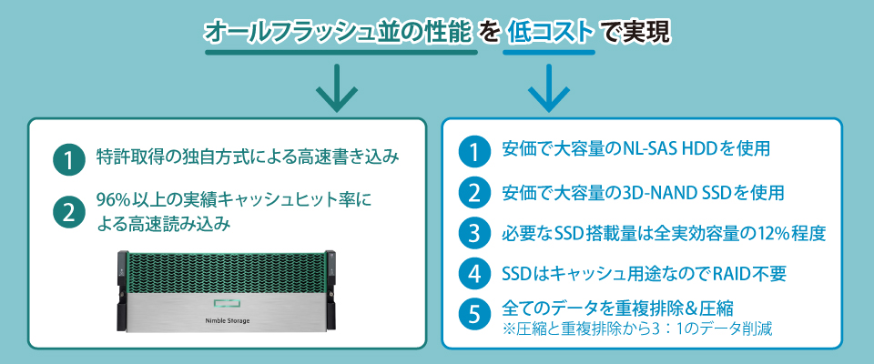HPE Nimble Storageのハイブリッドストレージは、独自の書き込み方式やNL-SAS HDDなどの活用により、オールフラッシュ製品と同等の性能を持ちます。そのため、高い機能を低コストで利用することができます。