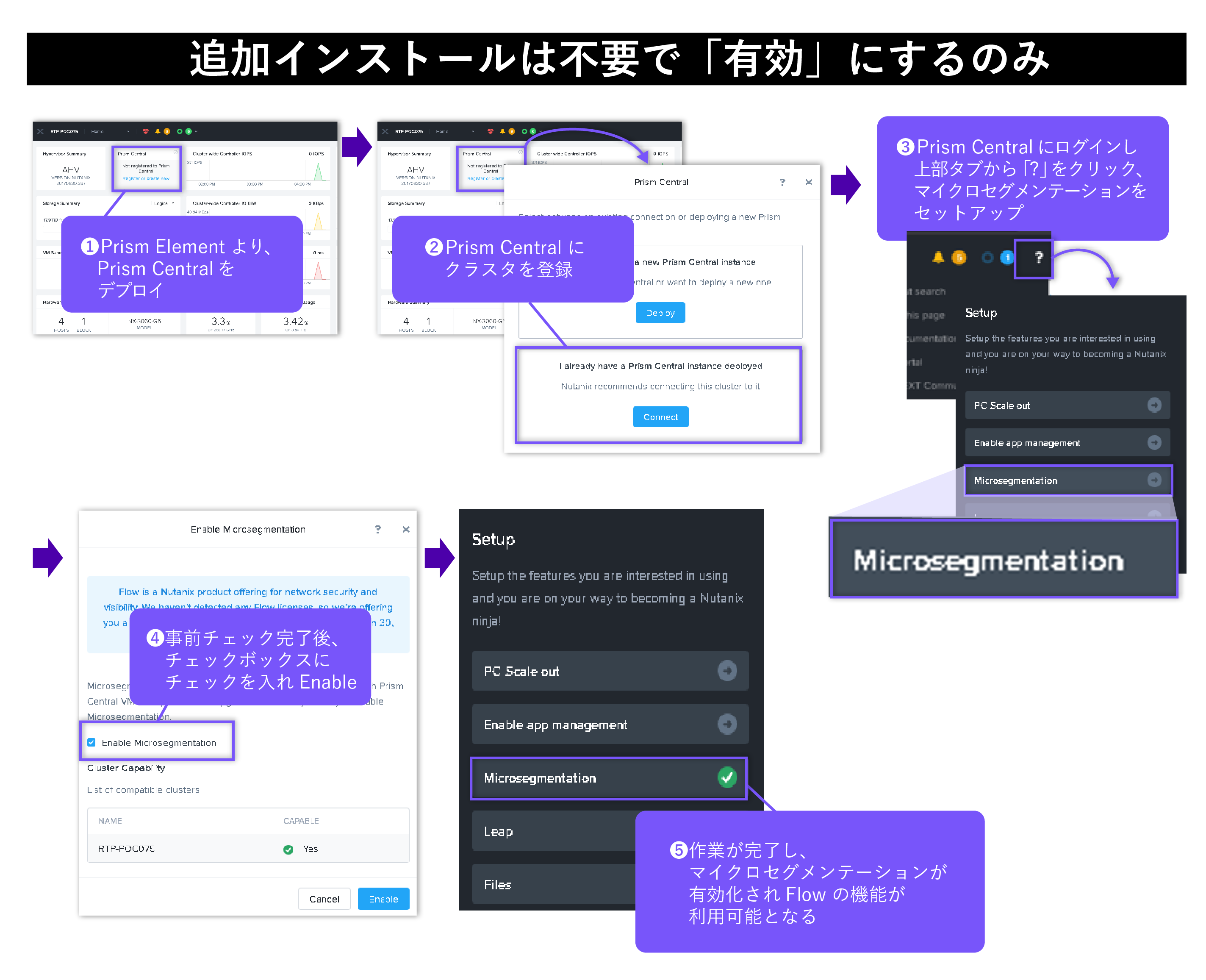 また、管理コンソールであるPrism Centralを利用することでNutanix Flowの有効化が容易に行えます。 このPrism Centralを用いることで、粒度の細かい設定や直感的な操作で一元管理ができます。