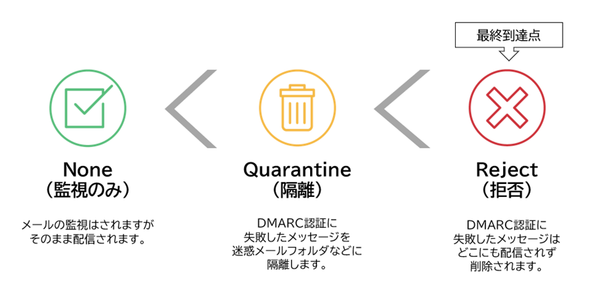 DMARCは3種類のポリシーの中からいずれかを選択することで、DMARC認証に失敗したメールをどう扱うかを設定できます。DMARCポリシーはp(ポリシー)=“ポリシーの種類”で表され、 処理方法が緩めなものから順に、none(監視のみ)、quarantine(隔離)、reject(拒否)とあります。最初の導入時はp=noneで設定し、最終的にはrejectへ変更するのがDMARC導入のセオリーです。