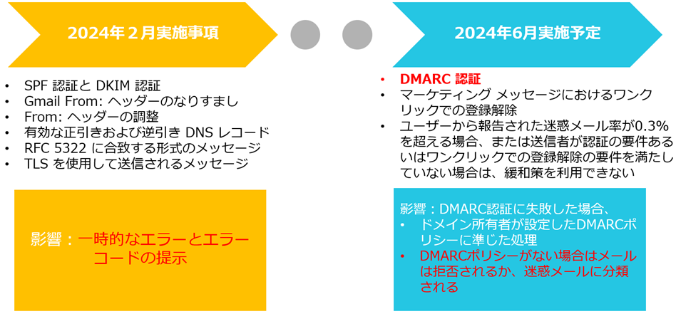 2月に有効化されたのは、送信要件を満たしていない送信者に対し、一時的にエラーコードを返すのみの処置なので、メールが届かない状況になることは少ない可能性があります。DMARC認証もまだ実施されていません。