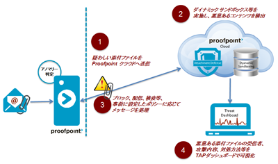 Proofpoint のサンドボックスはクラウドベースで、疑わしいURLのリンク先に含まれるマルウェアやメールに添付されたファイルの挙動をリアルタイムに解析することができます。
