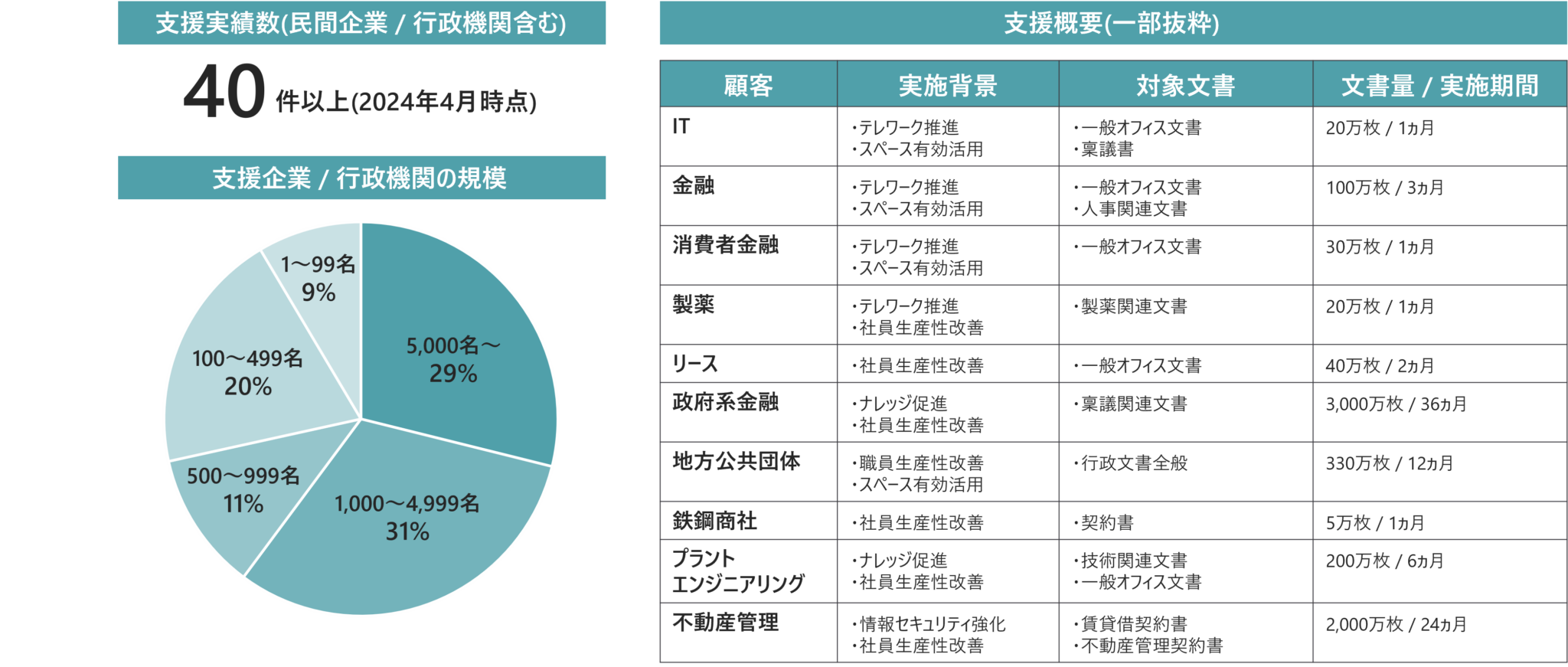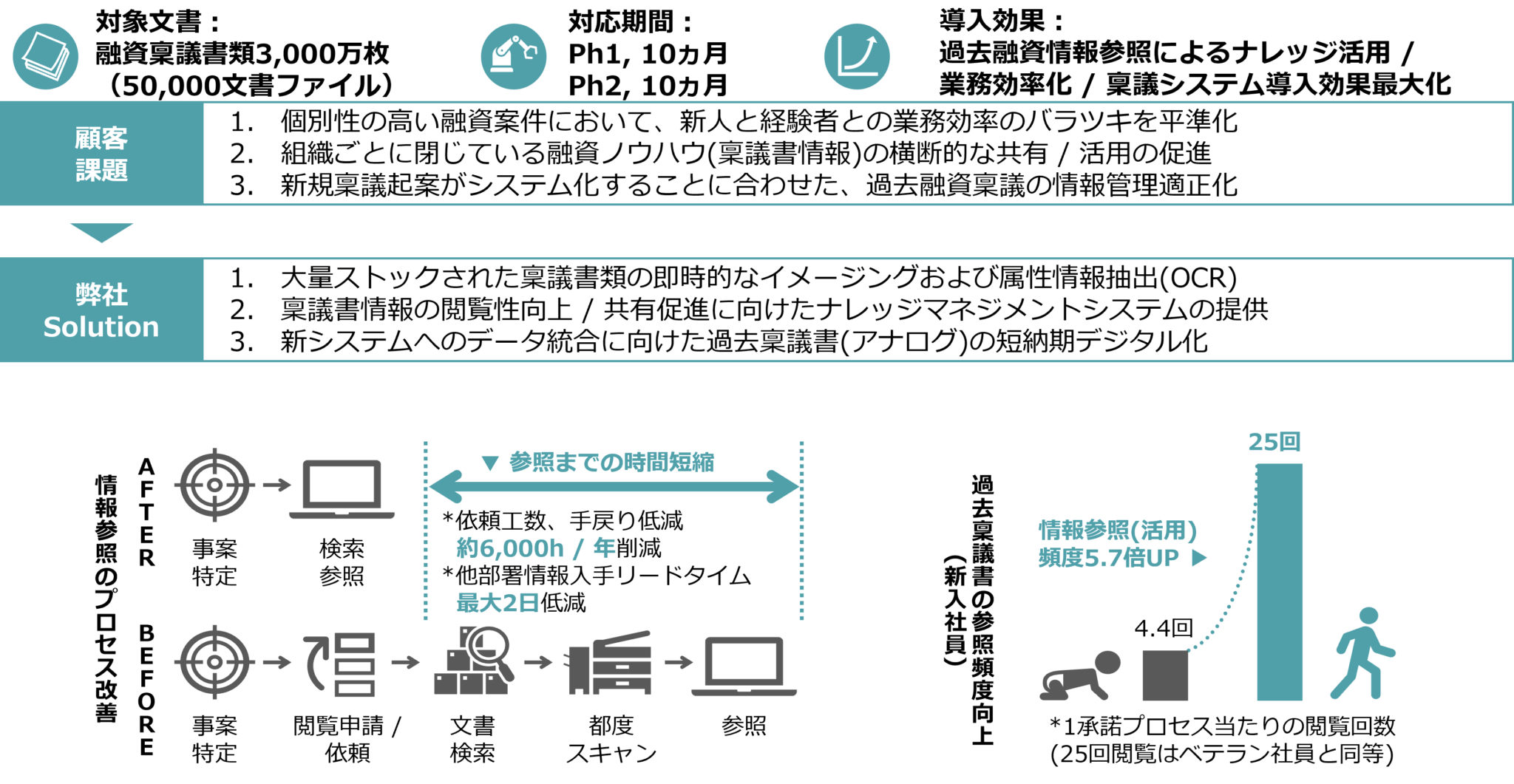 - 金融機関では融資関連や稟議書などレガシー文書を数千万枚規模で電子化し、約20カ月で完了。検索性の向上により過去案件の迅速参照、与信判断のエビデンス取得、監査対応の効率化を実現。