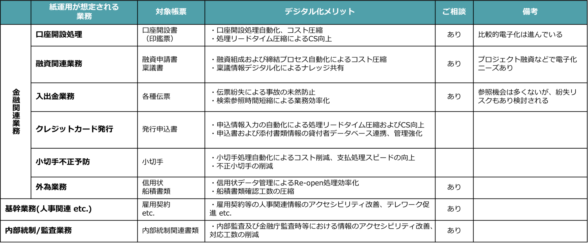 金融業界でアナログ情報が業務効率化やDX化を阻害しており、デジタル化が検討されている領域は以下の通りです。