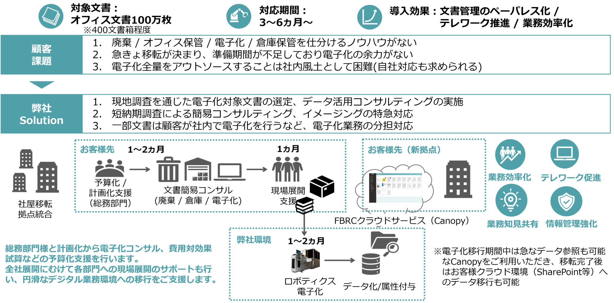 - オフィス移転やペーパーレス化プロジェクトでは、100万枚規模を3~6カ月で処理し、保管コスト削減とテレワーク対応を加速。設計段階で対象文書の優先度を棚卸しし、Canopy等のクラウド基盤へ移行、APIで既存システムへ連携することで、現場業務を止めずに段階的に展開。品質指標とSLAを可視化し、事故率の低減とリードタイム短縮を達成。