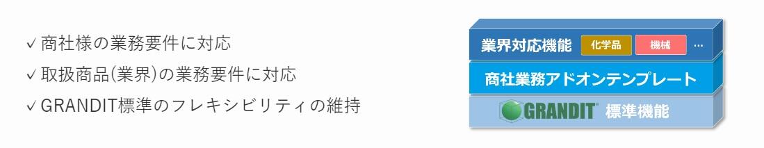 『これからの時代の商社様に合った基幹システム』を提供するために、数々の商社様への導入実績・ノウハウを活かし、丸紅株式会社様に導入した「GRANDIT」をベースに、新たな商社業務アドオンテンプレート「Natic Trade Master with GRANDIT/Natic Trade Master Cloud with GRANDIT」を開発致しました。