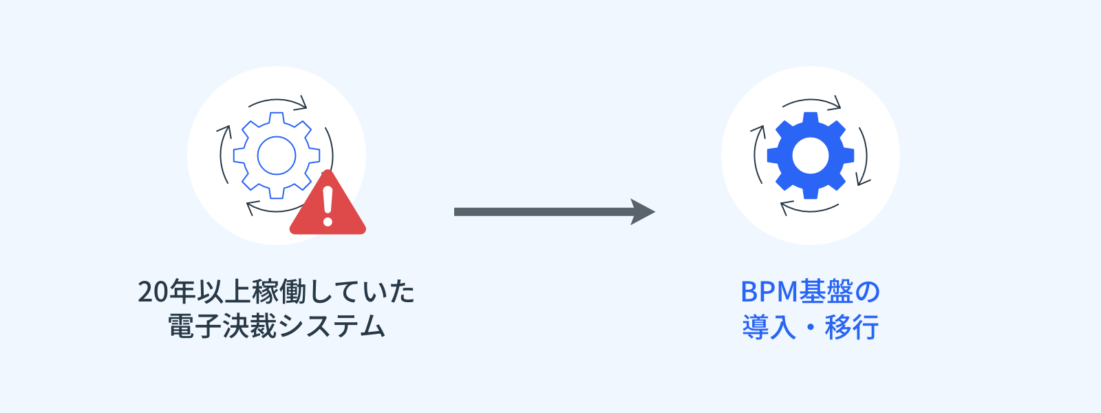 20年以上稼働する電子決裁システムは、複数機能が相乗りし肥大化、簡単な改修にも多大な影響調査とコストを要し、事業環境の変化に対応できない状態でした