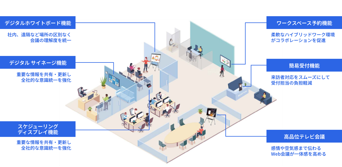 私たちはソフト、ハードの両面でデジタルを活用し、ワークプレイスを再デザインします。散在する情報の統合、パフォーマンスの可視化、快適なコミュニケーションツールなどを通し業務環境を改革。社員のエンゲージメント向上とチームワークの強化、生産性向上をサポートします。