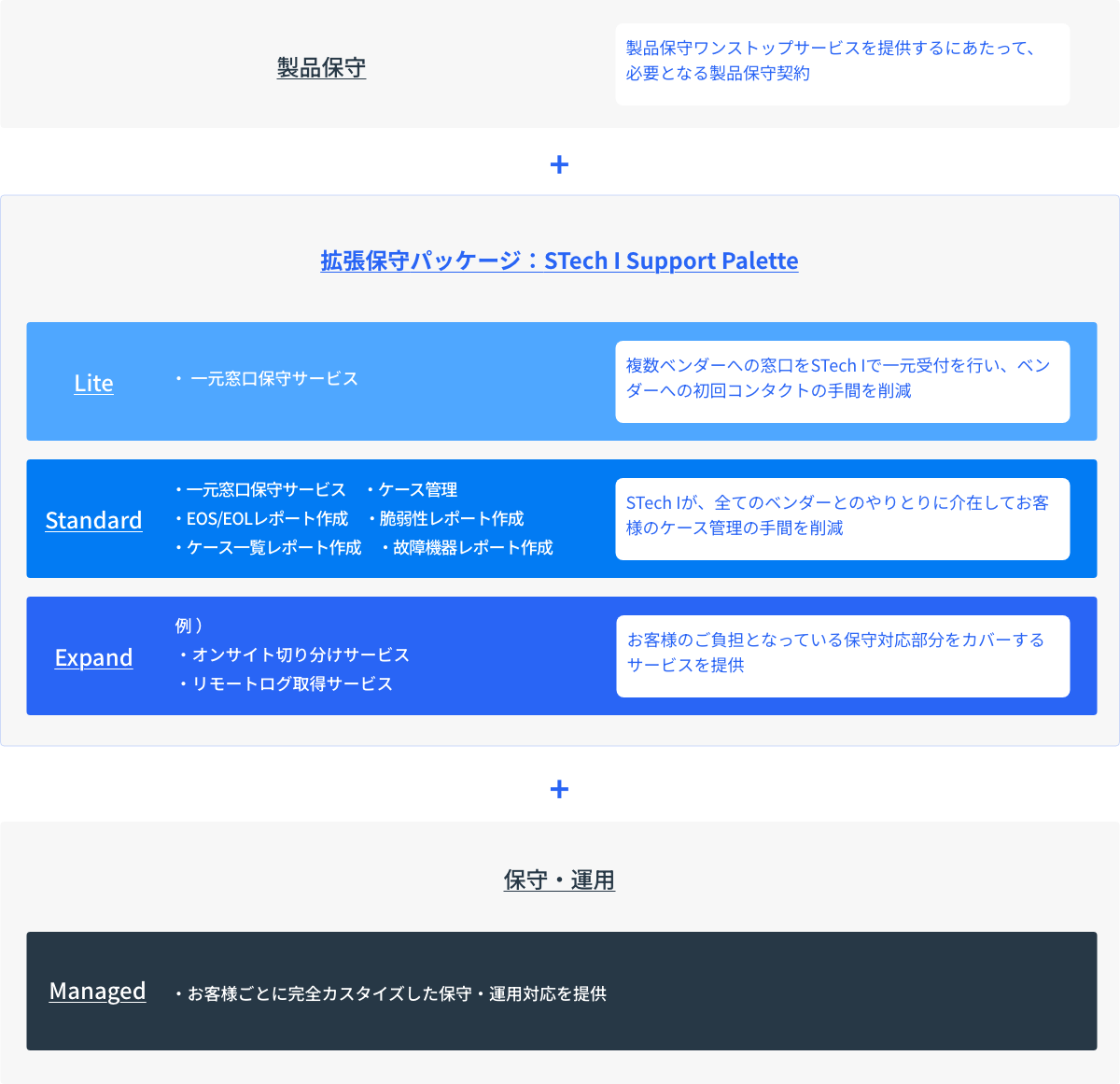 STech I Support Paletteは、一般的な製品保守契約でカバーしきれない「隙間」を補う拡張保守パッケージです。障害発生時の原因調査や報告など、高負荷になりがちな初動対応を支援し、運用負荷の低減を図ります。Liteプランの窓口一本化から、Standardプラン以上のインシデント管理まで、ニーズに応じて提供します。煩雑な保守対応の負担を軽減し、お客様がコア業務に集中できる環境づくりを後押しします。