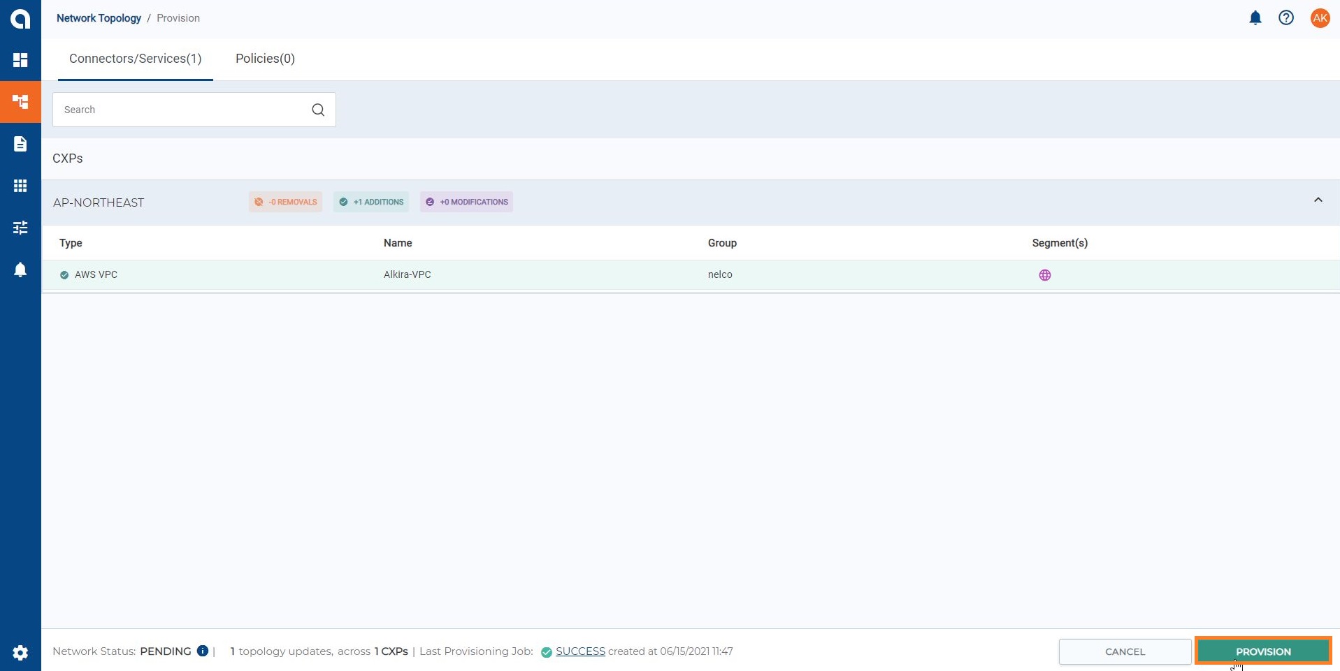 最後に設定内容を確認し、プロビジョンします。クラウドに接続するためのAWSのリソースはAlkiraによって最適な値で自動デプロイされます。